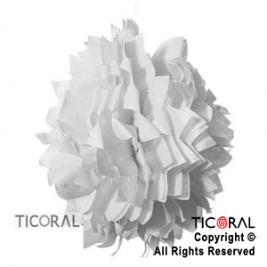 Es un adorno con forma redonda tipo de pompon. Se itiliza para decorar cualquier ambiente. Mide 30 cm de diametro. Es de color blanco. Se utiliza mucho para decoraciones. Es de fiselina, Polipropileno no tejido, no planchar , se lava con agua fria.