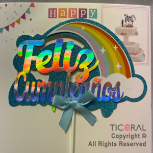 CAKE TOPPER CON 1 MOÑO FELIZ CUMPLEAÑOS CELESTE