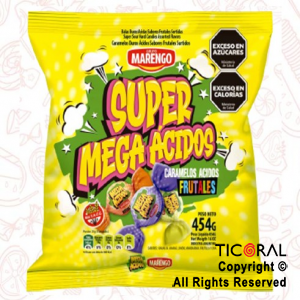 Bolsa de caramelos duros mega ácidos frutales surtidos. Contiene 70 unidades de 6.50 gr. Peso por bolsa: 454 gr. Se utilizan en cumpleaños infantiles (como regalo de fin de fiesta o para la piñata). Apto para celíacos. Sin TACC. Sin gluten. Gluten free.