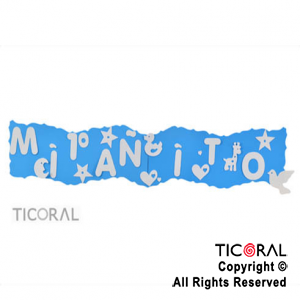 Guirnalda para cumpleaños de un año. Tiene apliques de letras blancas que forman la frase: "Primer año". Color: celeste. Material: goma eva. Medida: 1,10 metros. Ideal para decoración de fiestas de cumpleaños de un año.