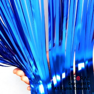 Cortina metalizada. Línea economica (LE). Color: azul. Medida: 1 de ancho por 2 mts de alto. Se utiliza para ambientación de fiestas y eventos. De flecos largos.