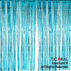 Cortina de plástico metalizada. Línea economica (LE). Color: celeste. Medida: 1 de ancho por 2 mts de alto. Se utiliza para ambientación de fiestas y eventos. De flecos largos.