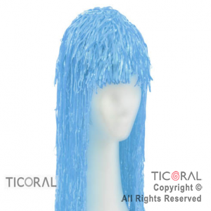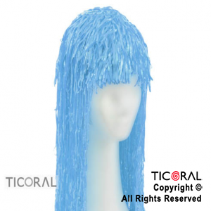Peluca larga de plástico celeste. Se utiliza en el carnaval carioca, como accesorio para disfraces o en fiestas temáticas (por ejemplo: tanda de pelucas, tanda de colores, etc.).