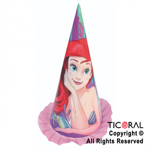 Bonete con diseño de "Princesa Sirenita". Alrededor del sombrero, tiene un decorado de papel maché. Material: cartón. Medidas: 28 cm.. Son para cumpleaños de niños (se reparten en cualquier momento de la fiesta o como souvenir). Pueden combinarse con otros productos de la línea de "Princesa Sirenita".