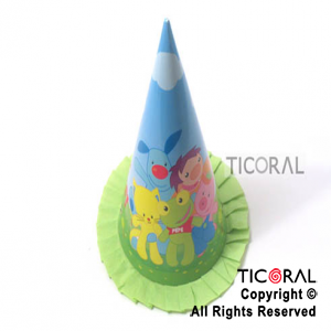 Bonete con diseño de "Sapo Pepe". Alrededor del sombrero, tiene un decorado de papel maché. Material: cartón. Medidas: 28 cm. Son para cumpleaños de niños (se reparten en cualquier momento de la fiesta o como souvenir). Pueden combinarse con otros productos de la línea de "Sapo Pepe". Producto recomendado para niños y niñas de 1 a 4 años de edad. El "Sapo Pepe" es un simpático sapo verde que junto a sus amigos Sapa Pepa, Cholito, Timoteo, Michu Michu y Pimpón divierten a los más pequeños cantando canciones y realizando coreografías originales y entretenidas.